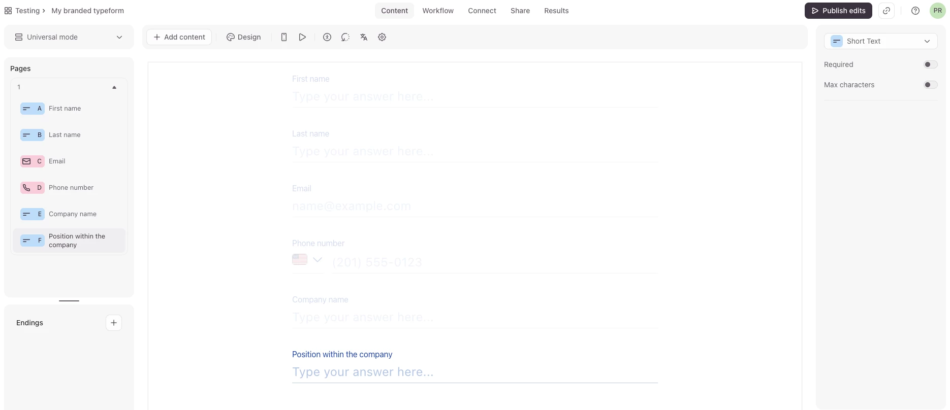 Hello, on the contact page I want to add a short text question after company name, “What is your position within the company?”. I cannot find how to add into the contact page rather than creating a new page.