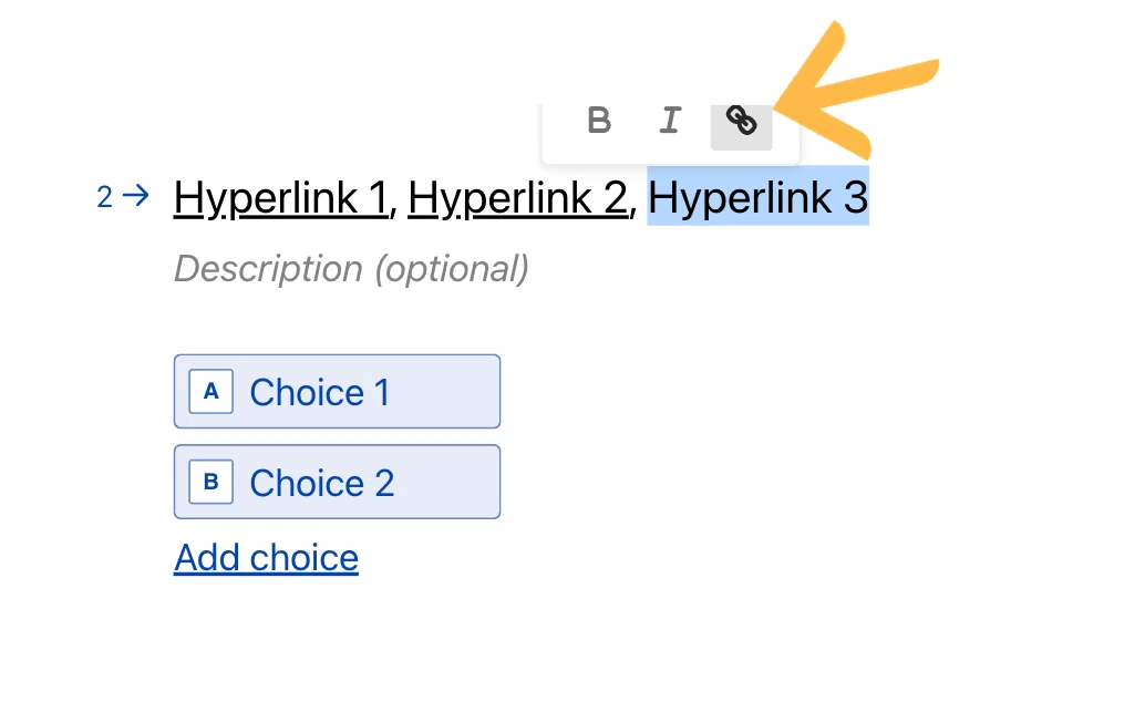 However, it’s not possible to add hyperlinks to answer options 😔 When you highlight the answer option, you can either use bold or italic on the text.