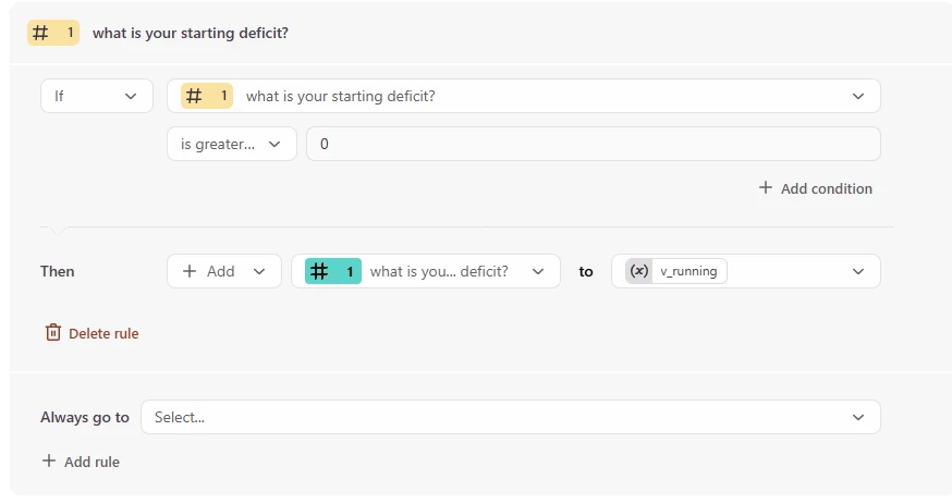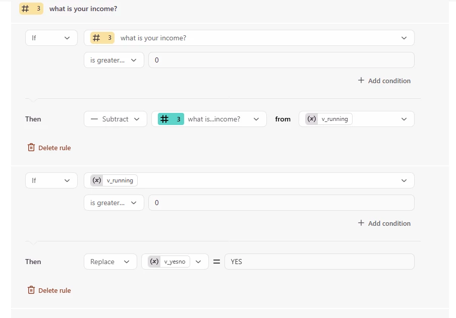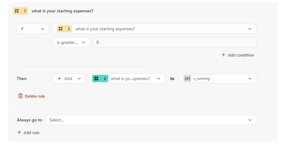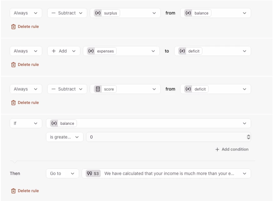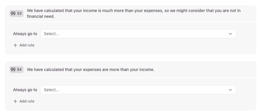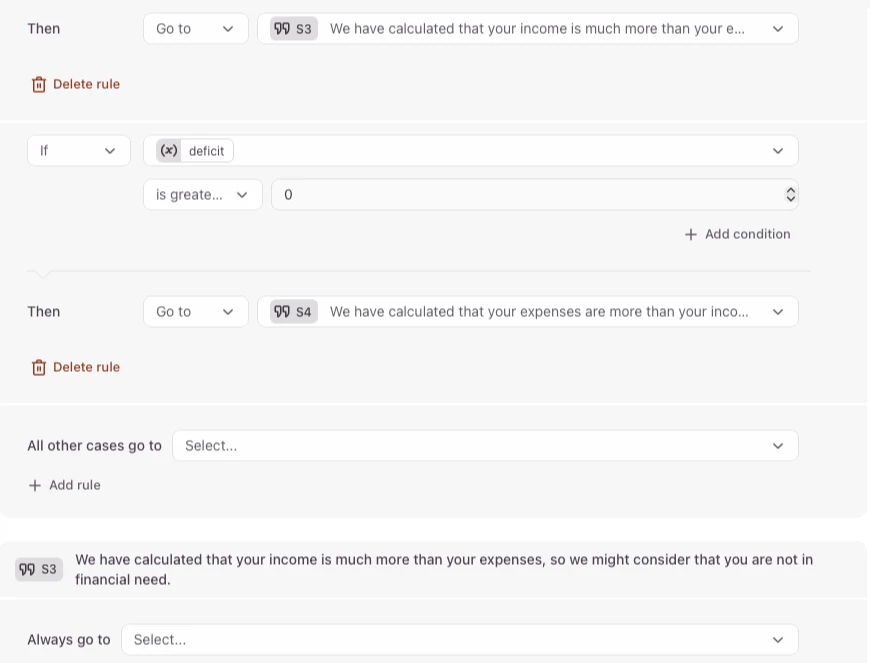 However, putting both calculations in the same questions ends in a mess. I can’t work out how to put two calculations, with two outcomes into the same question. When I put test figures into the questionnaire, the first calculation works ok, but it always proceeds to the second. Both statements can’t be true - either income is greater than expenses, or expenses are more than income.