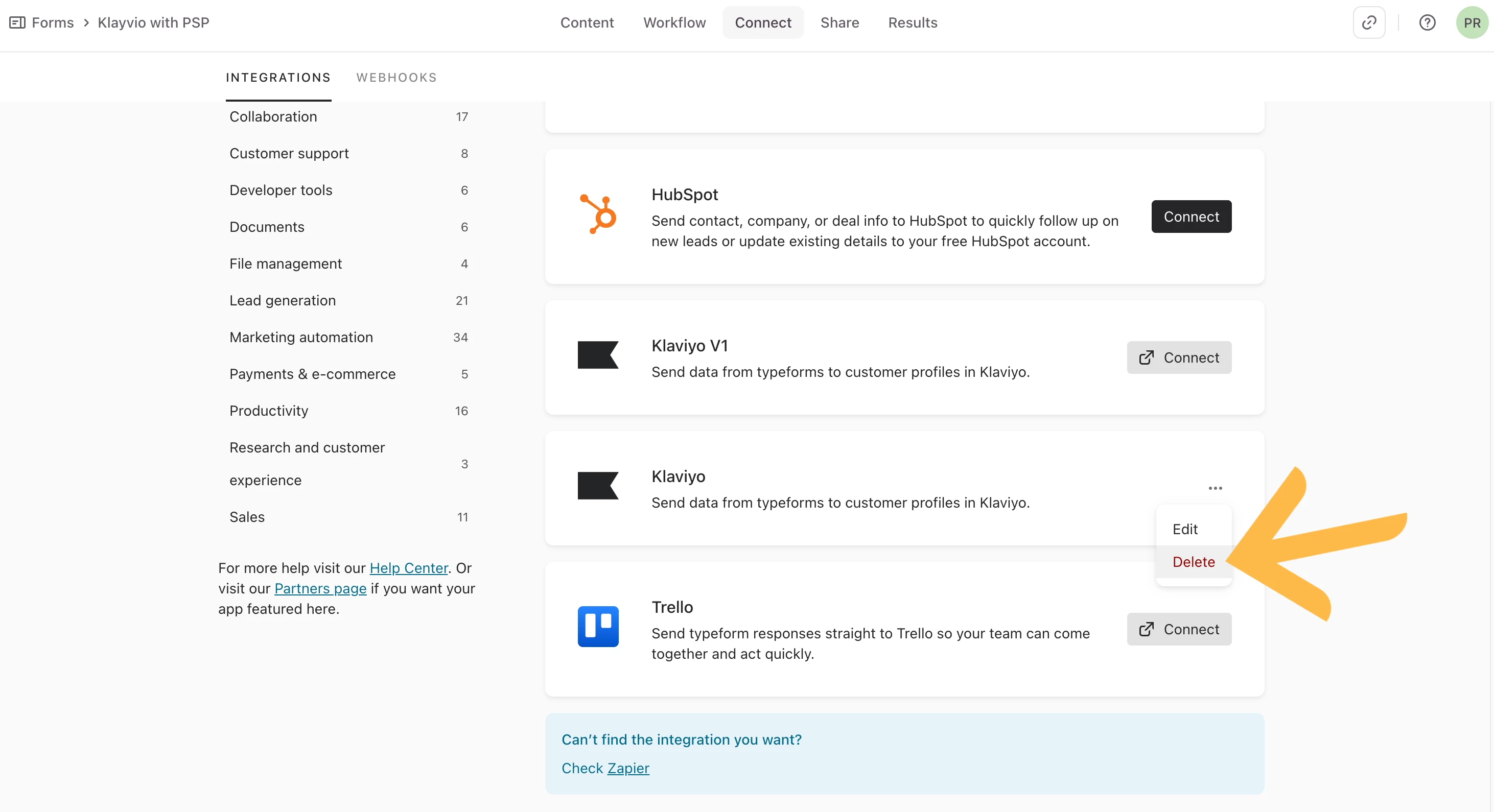 In the Connect tab of your form, click on the 3 dots next to Klaviyo, then select Delete to disconnect the integration.