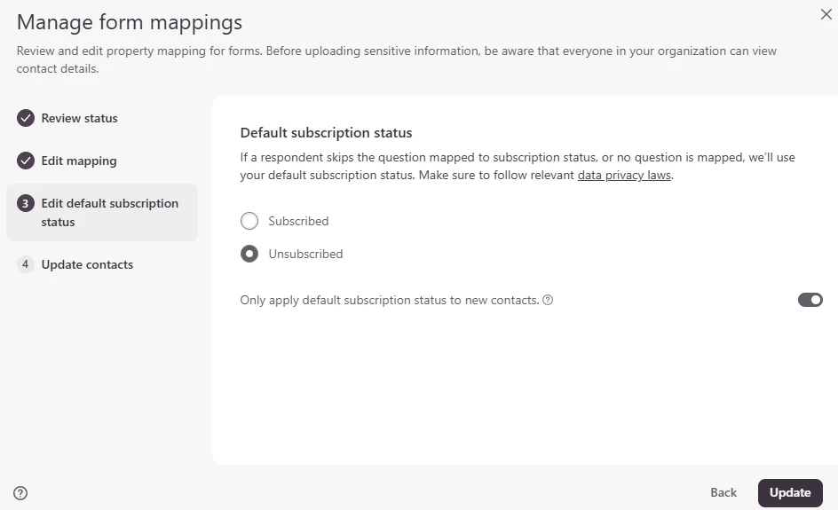 The next step, after you hit the Update button in the bottom right corner, is to review/edit the default subscription status. I highly recommend that you set up your default to Unsubscribed and apply that default to new contacts to the list. This will be the setting if they have not completed a form that you have mapped to the subscription status property.