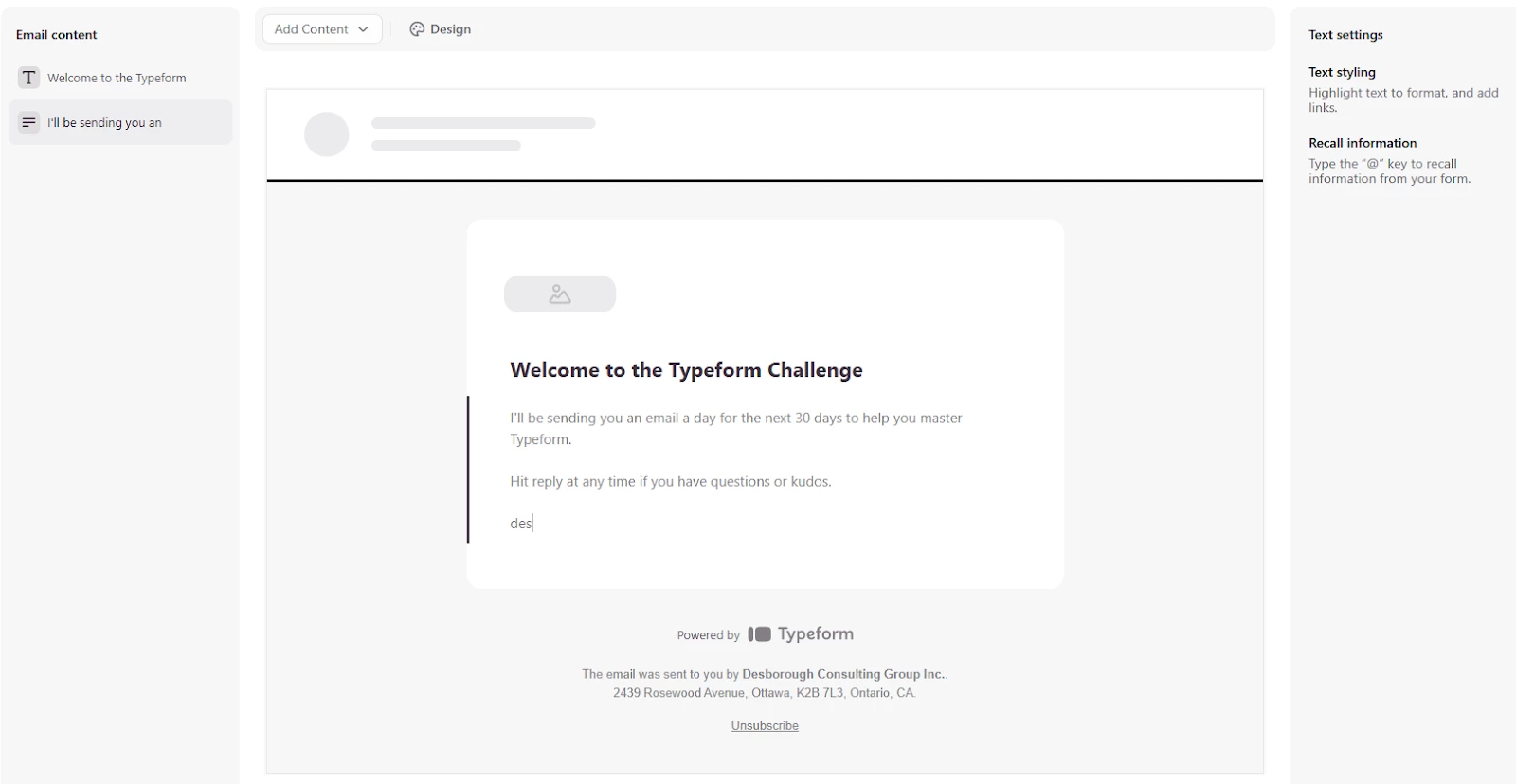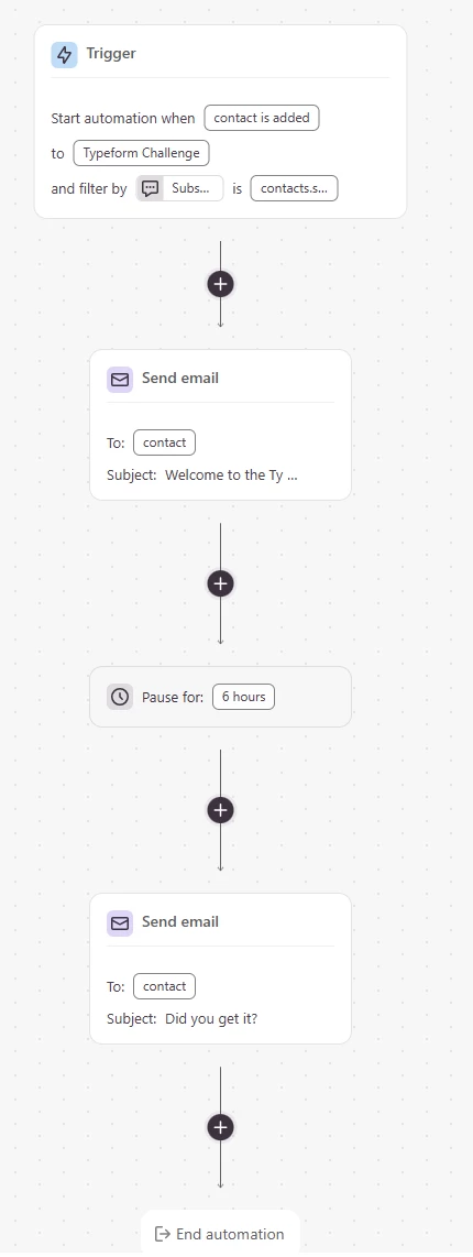 Now any time someone is added to the list (for my Typeform Challenge) they will get the two emails from me – the welcome and the 6-hour ones. I can set up a much longer nurture sequence if I choose to do so.