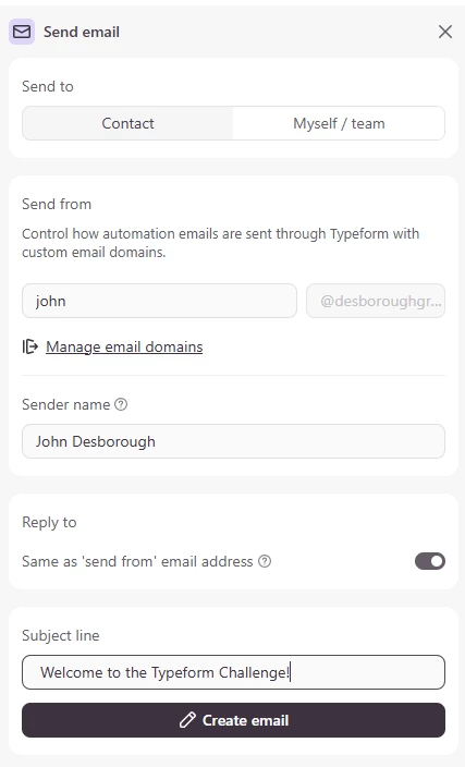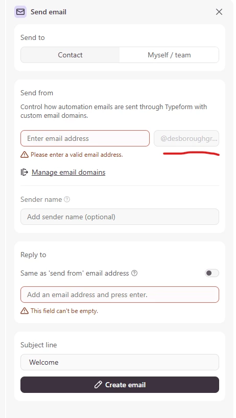 To use Automations with Contacts, you will first have to set up and authorize your email domain. You should start with this guide from Typeform on how to set up a custom email domain. It goes into great depth on what you need to do.