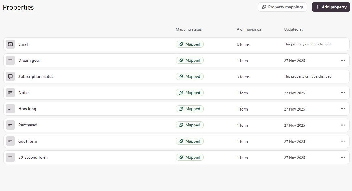 The image shows only three properties – email, subscription status and the mapping of the v_form custom variable to the ‘gout form’ property. That adds the trigger value into the property field.