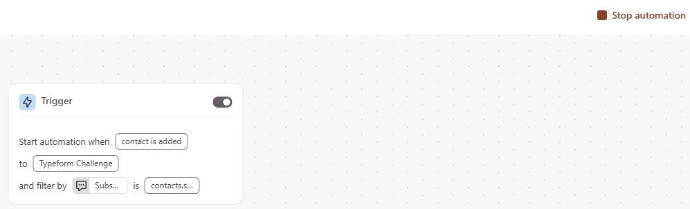Once you ‘activate’ the automation, you will see a toggle on the Trigger block and a ‘Stop automation’ button on the right hand side.