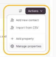 What we want to do at this point is add some custom properties to list – for each contact record that will be created in the list. To do this, click on the Actions drop down on the right of the screen and select Manage properties.