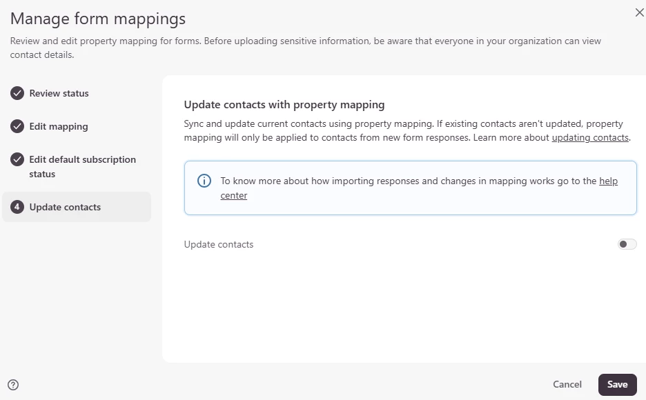 The last step is to determine if you want to update existing contacts with any changes. If you are setting up the triggers based on new form completions, then you can leave the Update contacts toggle ‘off’.