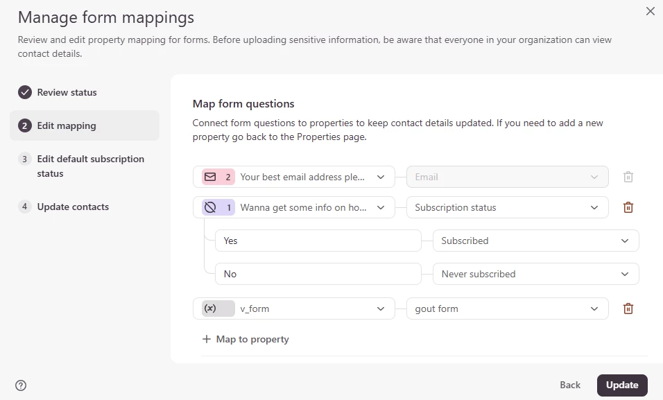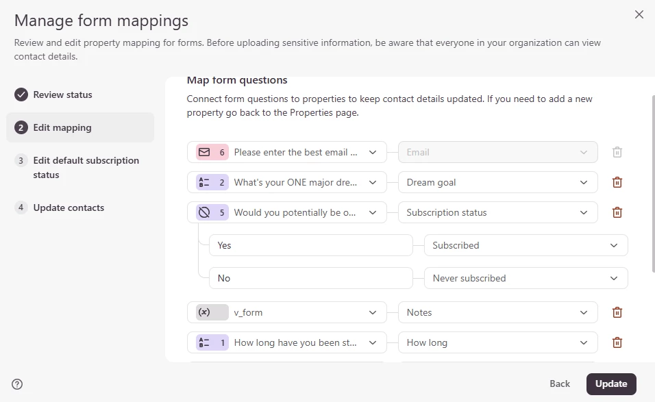 In this step in the process, you simply map the form questions to the appropriate contact database properties.