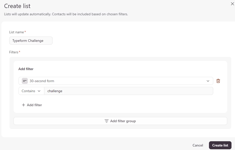 Note that I have based the filter on the contact property “30-second form” containing the word ‘challenge’ in the field. That word will be the value that is mapped into that field from a form mapping. Once you click Create List, your new contact list will appear.