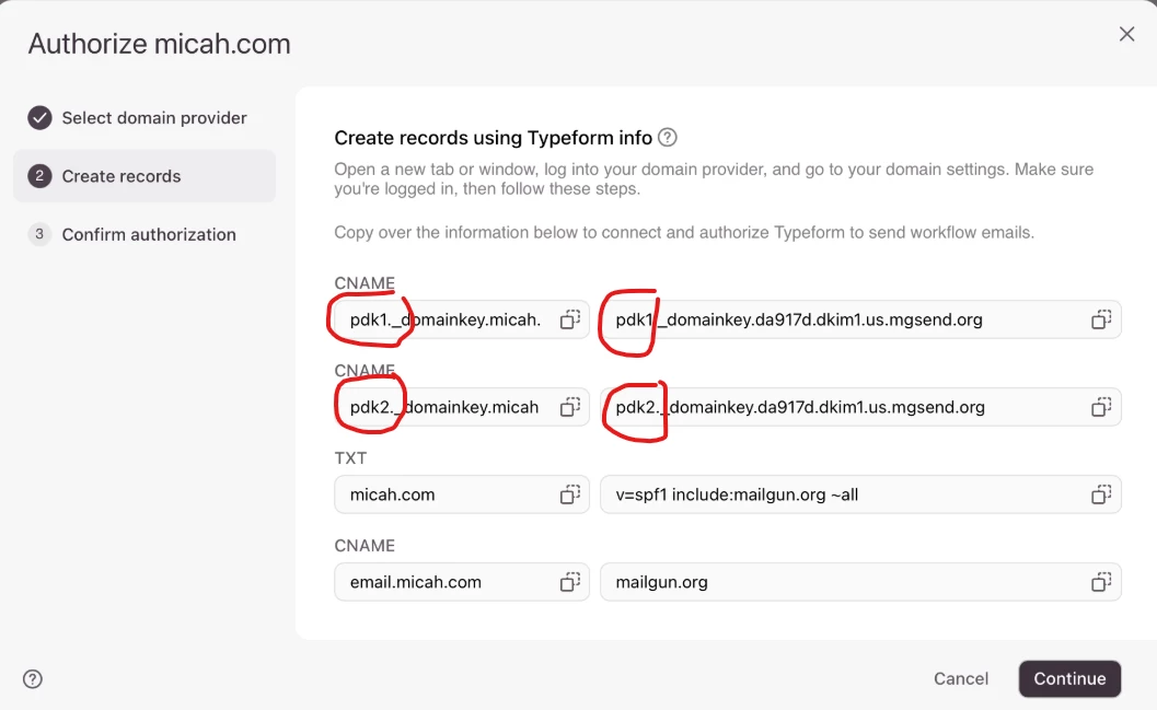 I’ve circled some parts of the entries in the image because I found that I already had CNAME records for my domain that started with pdk1 and pdk2. All you need to do is change the number in the string ie change the pdk1 to pdk3 and pdk2 to pdk4 … that will work to get you authorized.