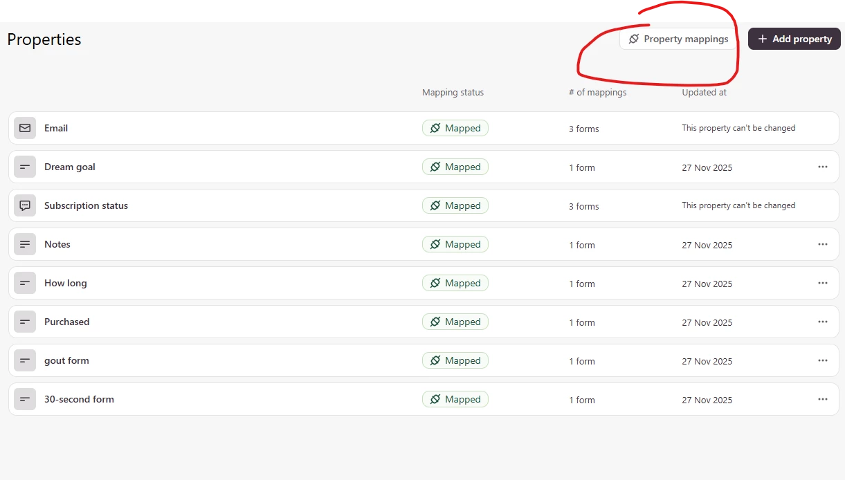 To do this, I created Contact Properties for each of the forms – if you look at the bottom of the image below you will see “gout form” and “30-second form” as two properties.