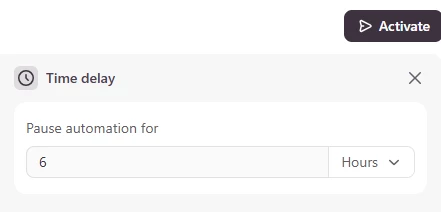 Click the + sign and choose time delay and in the Time Delay action box that appears on the right hand side of your screen select Hours from the drop down and enter 6 in the ‘Pause automation for’ box.