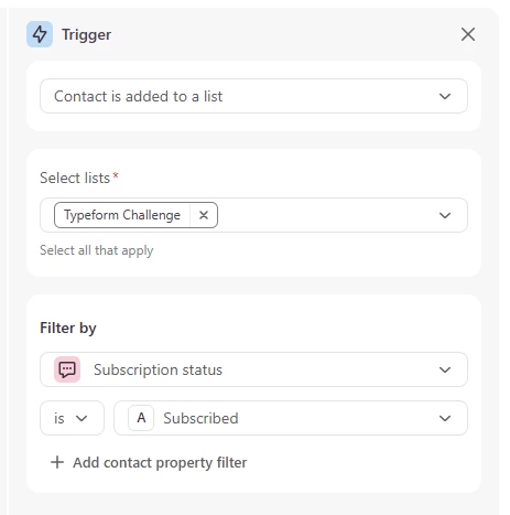 I am going to add another contact property filter to ensure that only subscribed people get this email sequence. Click on the Add contact property filter on the right hand side of the screen.