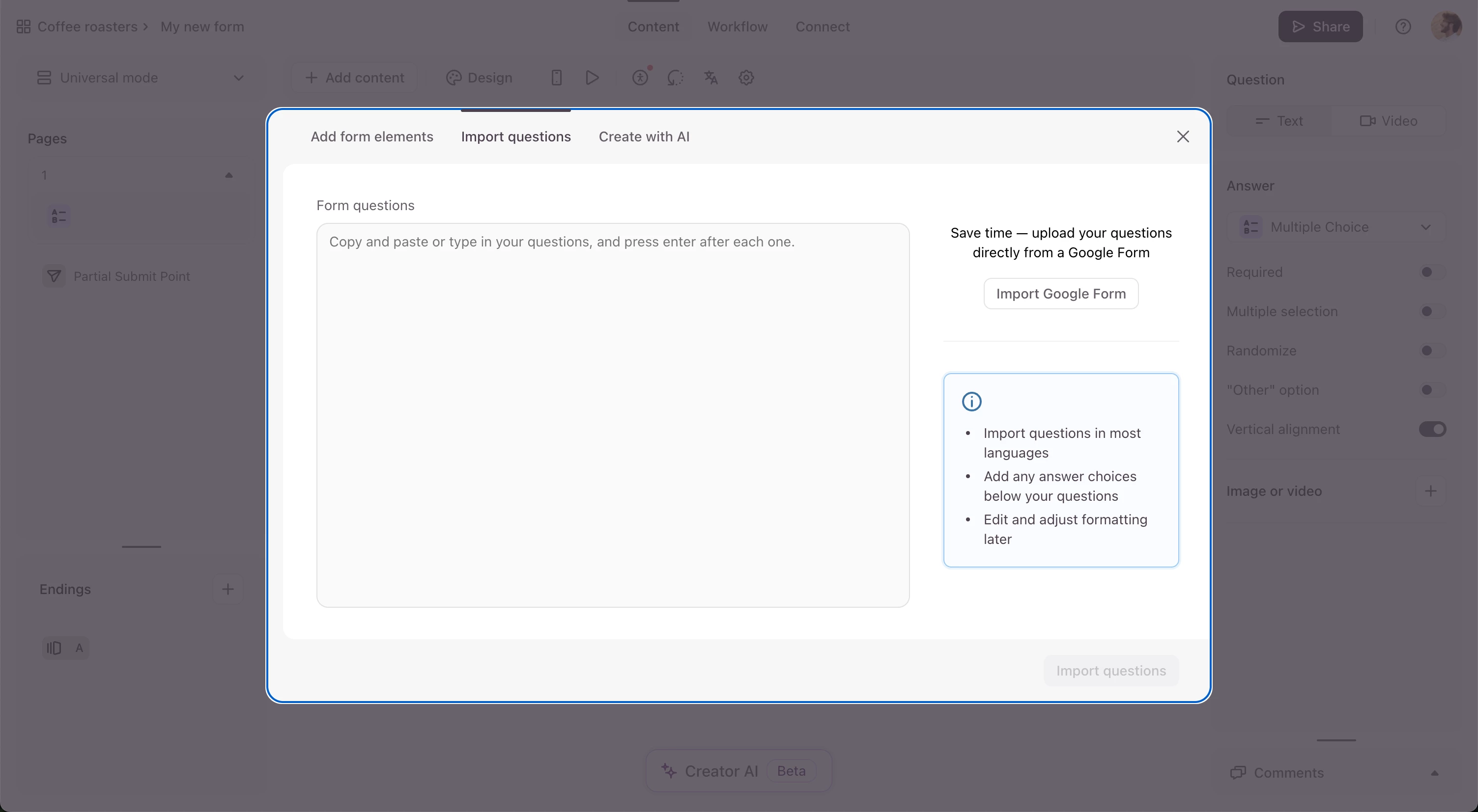 Meanwhile, for the first request, I suggest keeping a shared Google Sheet with your reusable lists and using our Import Questions feature. This gives you a centralized, up-to-date source of choices you can quickly import into Typeform.