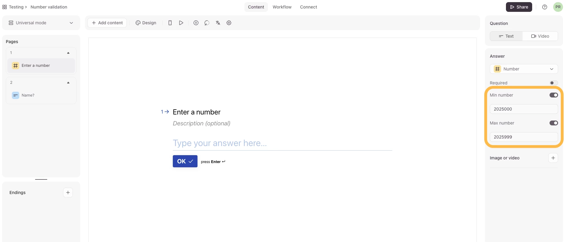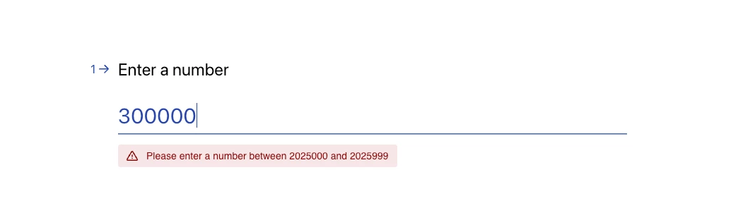 We have a number field where with validation of numbers between 2025000 and 2025999. When a user tries to enter any other number, he can pass this step successfully and only gets an error at the end of the form (he won’t know why he got the error!!).