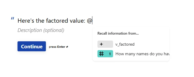 i just created a simple Statement page and as you can see, when you type the @ sign, the available answers and variables are there for you to select. Choose the variable and you should see the page looking like this