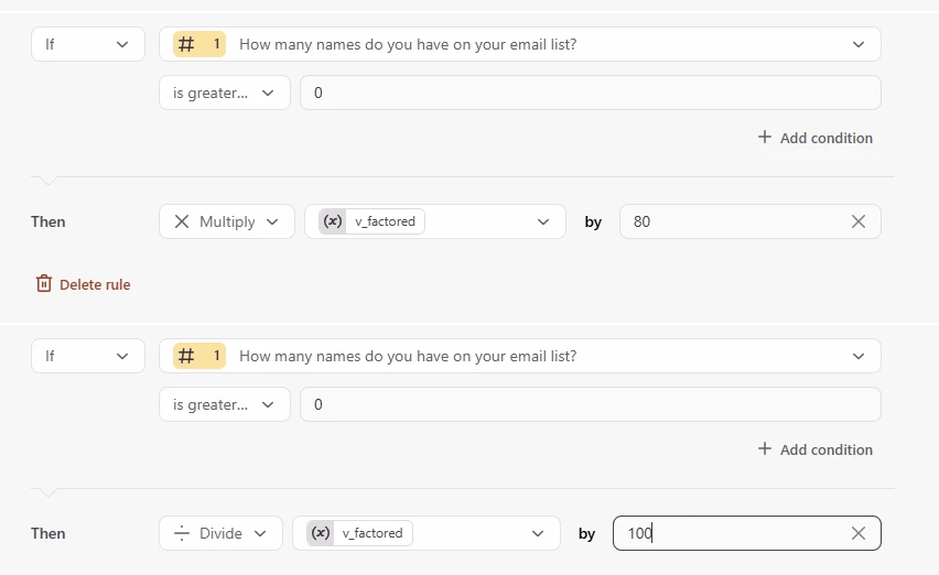 next we’re gong to multiply the value of the variable by the factor - and this is where i wish Typeform would allow for the use of decimal values in the calculations, but they don’t.