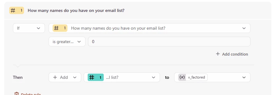note that you should probably set the initial condition to if the mailing list is greater than 0, which is what i set in this example. then you choose the operation for the Then (Add) what (the value from q1) to what (the variable) … you select those values from the drop downs.