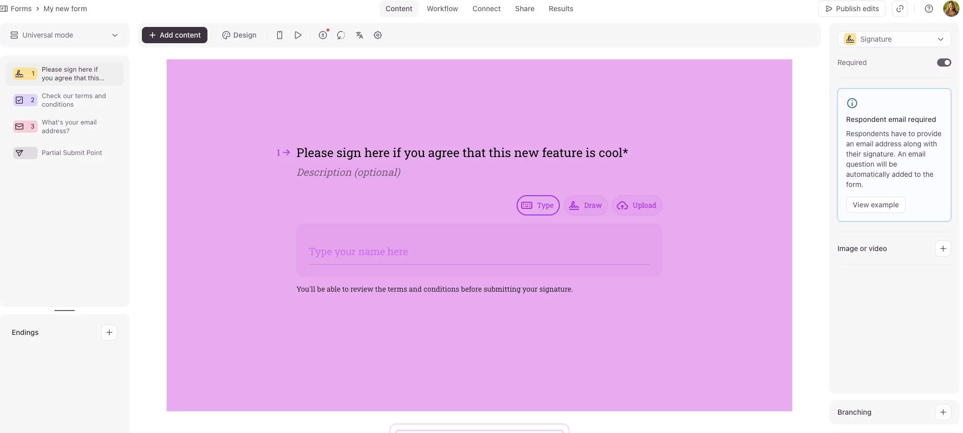 Signature Question has landed in Typeform 🚀 Collect legally valid electronic signatures right inside your typeform, no need to redirect them to an external tool.